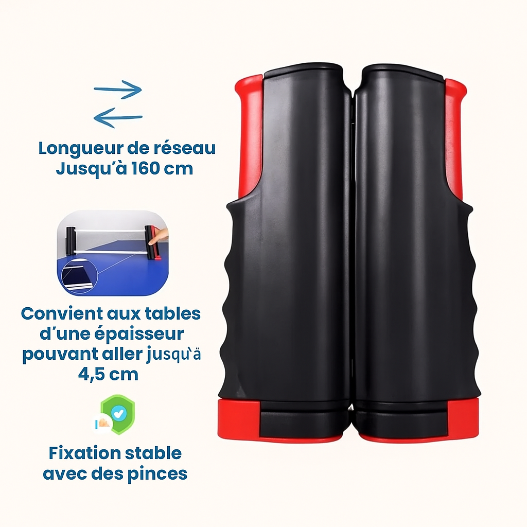 Le filet rétractable s'installe en quelques secondes. Dépliez, fixez et jouez ! Pas de tables encombrantes, pas de commandes. Jouez où vous voulez !